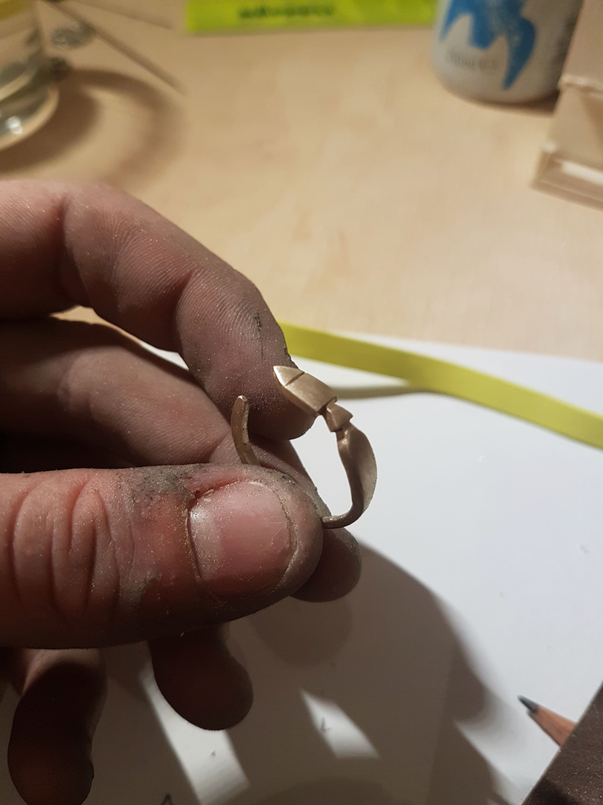 Mein erster Ring, ein Pfeil, welcher um den Finger fliegt. Dieser wurde aus einem Rohrstück gefertigt und wurde nur zurecht geschliffen, nicht aber erhitzt und verformt.