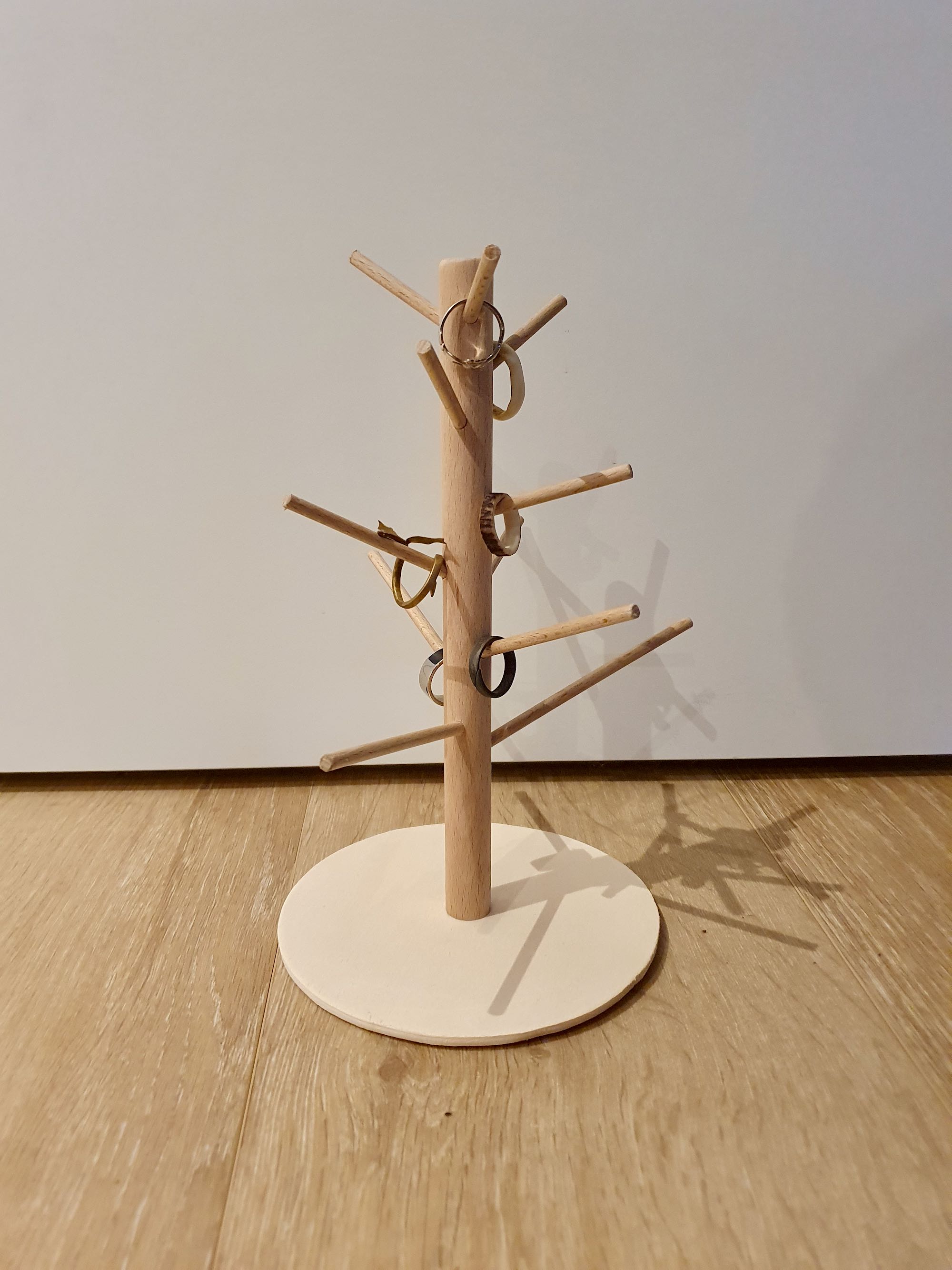 Um die Zahl der herumliegenden Ringe zu reduzieren wurde ein Schmuckbaum als Aufbewahrunsmöglichkeit gefertigt.
