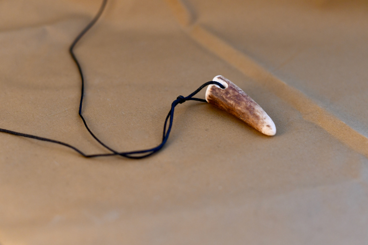 Um Geweih als Arbeitsmaterial zu erproben wurde ein runder Ring gefertigt, der die Spuren des Waldes trägt.